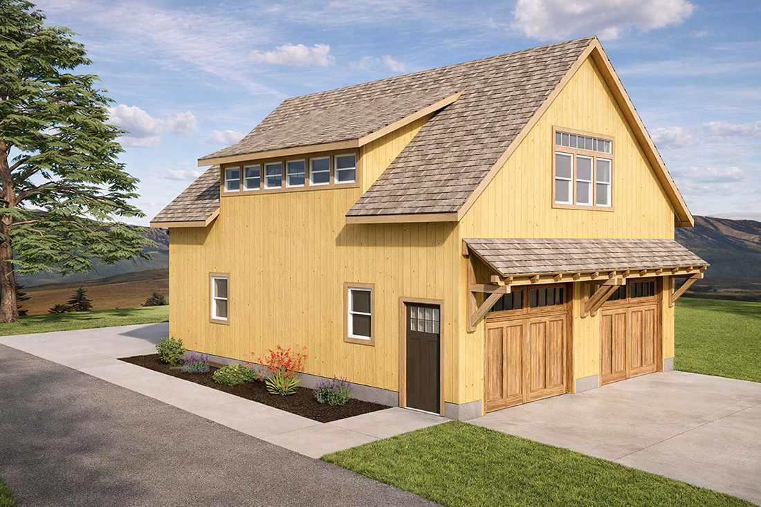 Misty Hill Barn is a charming barn featuring an open floor area with two large garage doors and an enclosed lean-to with a smaller garage door. There are also a variety of dormer options to add to this barn.